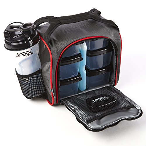 Fit and Fresh Jaxx FitPak Meal Prep Bag and Container Set with 6 Leakproof Portion Control Containers, Ice Pack and 28-ounce Jaxx Shaker Cup, Black/Red